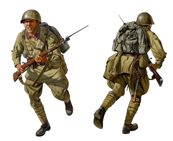 В руках - 7,62-мм винтовка Мосина обр. 1891/1930 гг. со штыком. Она прослужит бойцам РККА до конца войны.